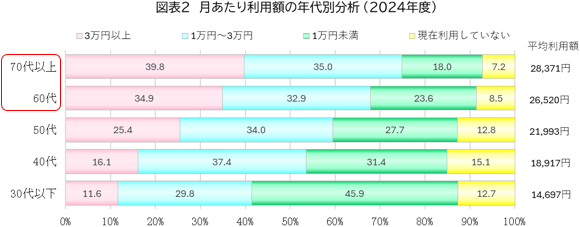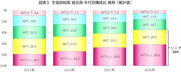 2024年度全国生協組合員意識調査によれば、生協組合員の構成比は60代以上のシニアが過半を占める(図表1)。またシニアほど生協の利用金額も高い傾向が見られ(図表2)、結果として供給高に占めるシニアの購買シェアは約65%に達していると推計される(図表3)。